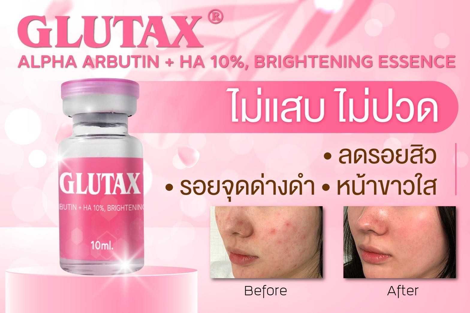 Glutax Alpha Arbutin 10% +HA. น้ำสีชมพู เป็น เมโสแบบพิเศษน้ำสีชมพูที่มีส่วนผสมของ สารสกัดธรรมชาติหลายชนิด (Meso White) ซึ่งร่วมกันทำงานยับยั้งการสร้างเม็ดสีผิว ป้องกันความหมองคล้ำของผิวที่ถูกกระตุ้นจากแสงแดด มีสารที่ช่วยต่อต้านอนุมูลอิสระที่เป็นสาเหตุของการเกิดริ้วรอย นอกจากนี้ยังให้ความชุ่มชื้น กระชับผิว โดยไม่มีอันตรายต่อผิวช่วยลดการสร้างเมลานิน ลดรอยฝ้า และจุดด่างดำ ต่อต้านการเกิดอนุมูลอิสระของผิว สามารถเห็นผลได้ดีแม้เป็นฝ้าลึกหรือรอยด่างดำที่ทิ้งเวลานาน หรือด่างดำเฉพาะจุด อย่างปลอดภัย Alpha arbutin คือ สารสกัดที่ได้จากพืชหลายชนิด ทำหน้าที่เป็นตัวกระตุ้นเซลล์ผิวให้ยับยั้งการผลิตเม็ดสีเมลานิน ด้วยกลไกการยับยั้งปฏิกิริยาออกซิเดชั่นของเอนไซม์ไทโรซิเนส ที่เป็นกระบวนการที่ก่อให้เกิดการสร้างเม็ดสีผิวส่งผลให้ผิวคล้ำเสียหรือเกิดจุดด่างดำ และเป็นสารที่ได้รับการยืนยันแล้วว่าเป็นสารสกัดที่มีประสิทธิภาพสูงและปลอดภัย ผลไม้ที่มีอาร์บูติน เช่น แบเบอร์รี่, บลูเบอร์รี่, แครนเบอร์รี่, มัลเบอร์รี่, ลูกแพร์ เป็นต้น